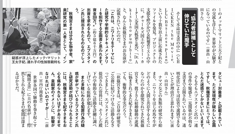 女性自身はなぜここまでセンセーショナルなタイトルを付けるんでしょうか。いかにもエプスタインと秋篠宮殿下が接触があり紀子さまが愕然とした、ビックリ驚愕したようなタイトルです。記事の中身をじっくり読めば上記に抜粋したように、秋篠宮殿下にとっては迷惑としかいえない、で締めているのですが、それならワザワザ記事にする必要ないでしょうに。