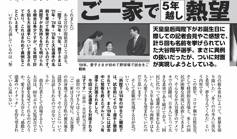 天皇がこんなミーハーで良いんでしょうか。イチロー選手とダルビッシュ選手とも対面されているので、今回は大谷選手とも対面されるはず、とも書いています。で、バミリ一家は3人一緒に3月に岩手県の東日本大震災の被災地に訪問されるので、大谷選手の出身地岩手県で「大谷選手と会いました」とニタニタと話のネタにするのですか。 何のための3人一緒に被災地訪問なのか。ため息が出てしまいます。 とかく上皇夫妻の時から「強いご希望」が出てくるようになりました。
