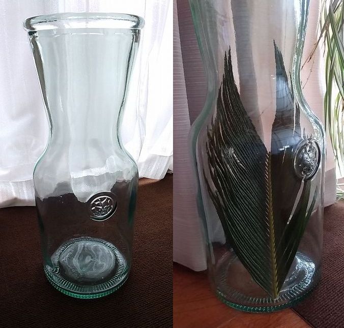 先週持ってきたシュロをどうしようか、どこに置こうかと思ったのですが丁度よく縦50cmくらいのガラス瓶がありました。このガラスの花瓶は廃業したお店から定価11,000円を9割引きで買いました。旦那から何に使うんだ~と言われたのですが、イタリア製の大きな薄い緑色のアンティーク風に見える重たいガラスの花瓶が何となく欲しくて買ってしまったのでした。