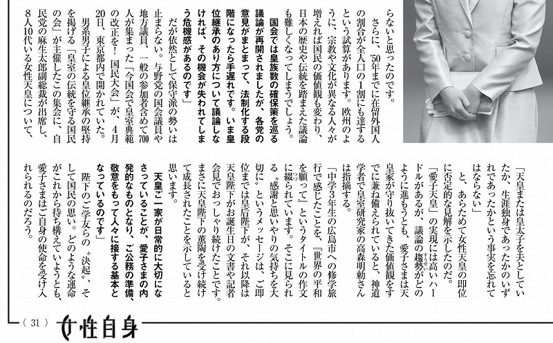 チラリと女性自身最新号を見ましたが、「愛子天皇」の道が無くなったからか、グラビア、記事と凄い持ち上げ方で必死さが伝わりました、無駄な足掻きですが wwww