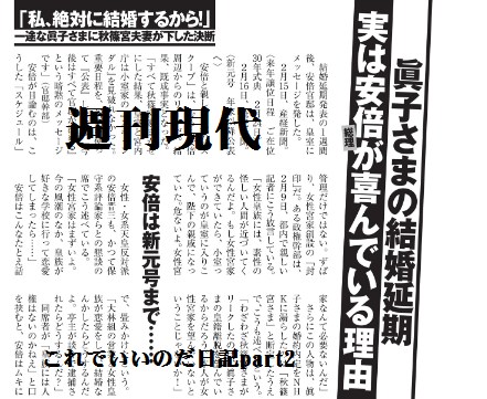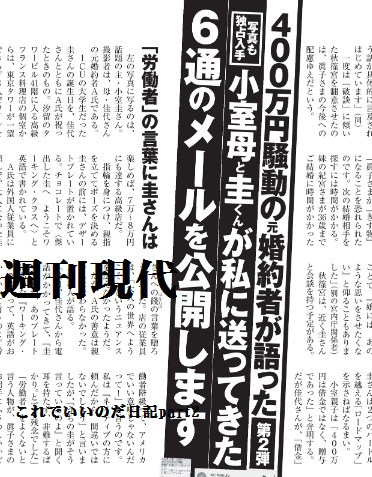 週刊現代・眞子さま結婚延期第2弾 ②小室圭君の誕生日 成人式でアッシー、メッシーのA氏と安倍総理これだから女性宮家創設は駄目なんだ。