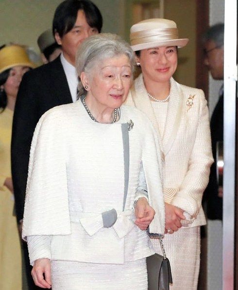 白いアンサンブル姿で演奏会を鑑賞された美智子さまに色調を重ねられるように、
