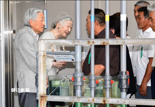 ウニ種苗生産センターで、関係者らと言葉を交わす天皇、皇后両陛下