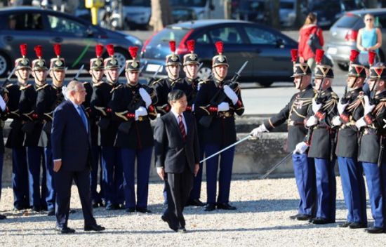 画像 歓迎行事に臨まれる皇太子さま=11日午前、パリ