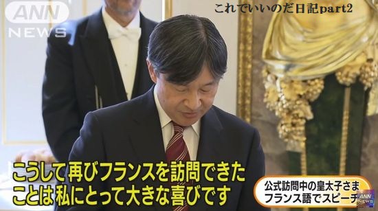 私はフランス在住の日本人ですが、フランス人夫とともに皇太子さまのこのビデオを見ました。NNN以外にもASAHIのビデオも見ました。私たちの感想としては、ゆっくりですがとてもはっきりわかりやすスピーチされているという事です。久子さまのフランス語はもちろん素晴らしかったですが、皇太子さまのスピ-チもとても堂々として良かったと思います。皇太子さまの発音は昨日今日始めた方のものではなくきれいだったと思います。フランス語はたとえ原稿を読み上げるだけでもとても難しいのです。