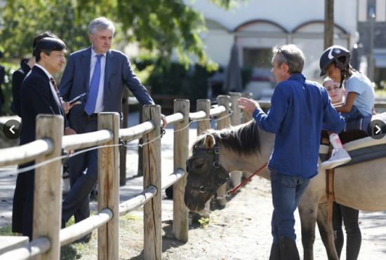 画像 障害者施設「レ・ザミ・ド・カレン」で、動物セラピーの説明を受ける皇太子さま=2018年9月11日、パリ、代表撮影