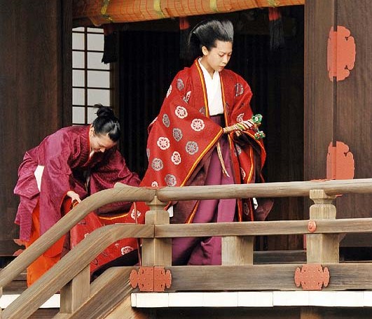 檜扇(ひおうぎ)を手に回廊をゆっくりと進み、皇室の祖神・天照大御神