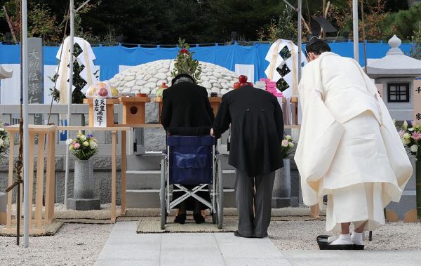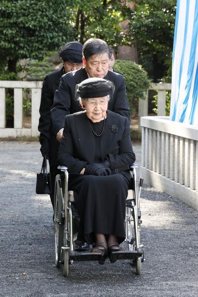 三笠宮妃百合子さまが車いすから立ち上がって玉串をささげた後、