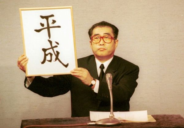 小渕恵三官房長官が記者会見室で、「平成」と墨で書かれた生乾きの2文字を掲げた。
