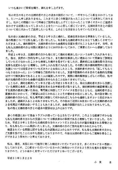 小室さんのコメントも、自分たちに都合の良いことしか言ってないけど、公表したんだから良いでしょ的な気持ちなのかな。